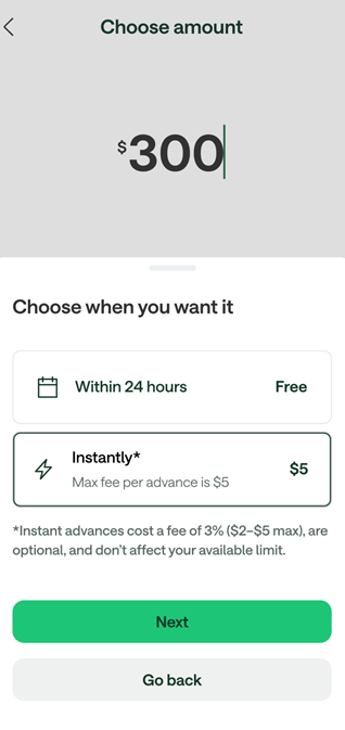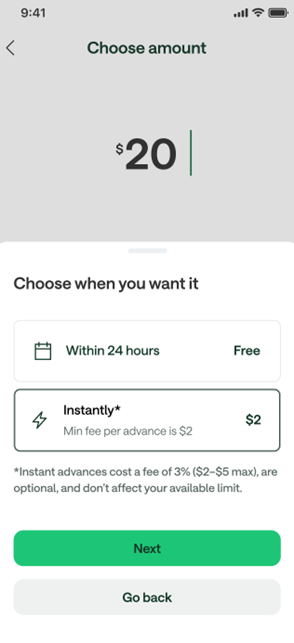 - You can tap the option Instantly for a 3% fee of the advance amount, with a built-in minimum and maximum fee amount ($2 minimum and $5 maximum), or