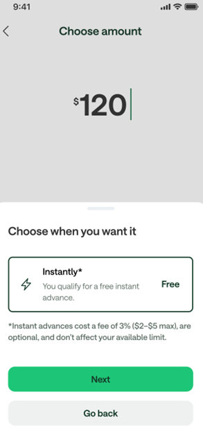 Some members may qualify for a free instant advance and will see “Free” instead of a fee.